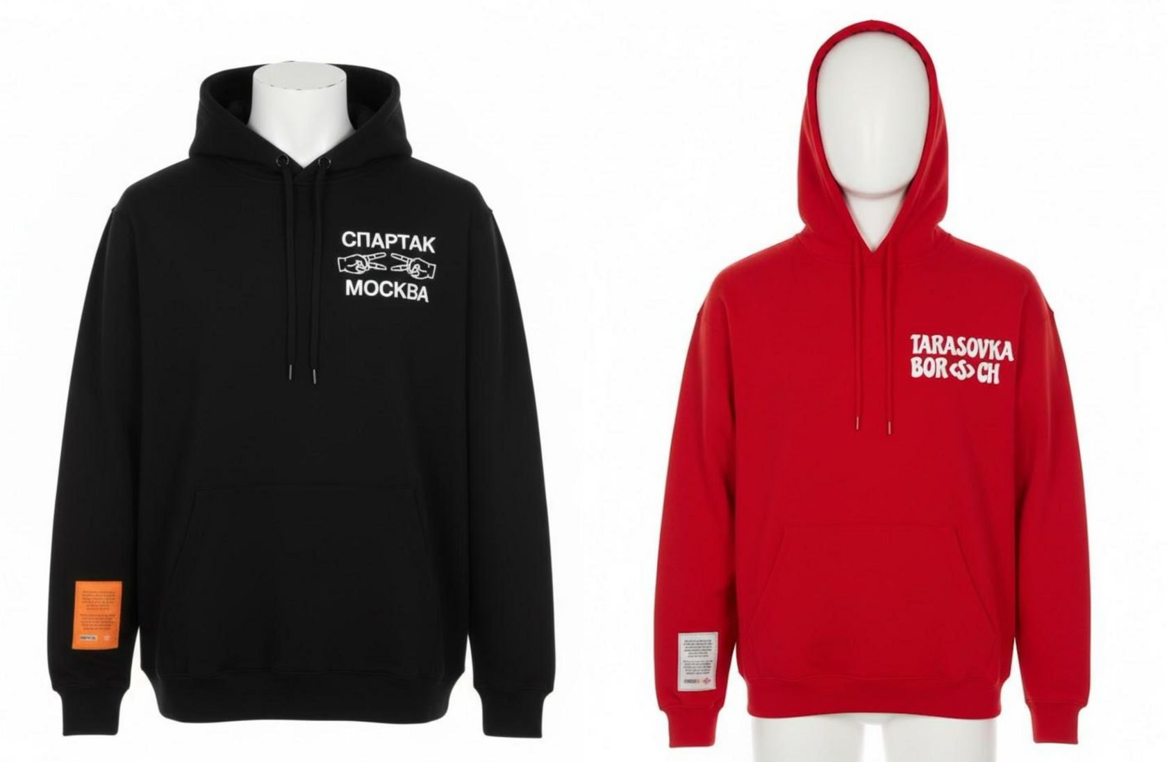 Разные фактуры материалов - от плотного футера до ткани с пич-эффектом - потребовали индивидуальной настройки печати. Все макеты адаптировались, чтобы логотипы и шрифты выглядели чётко.